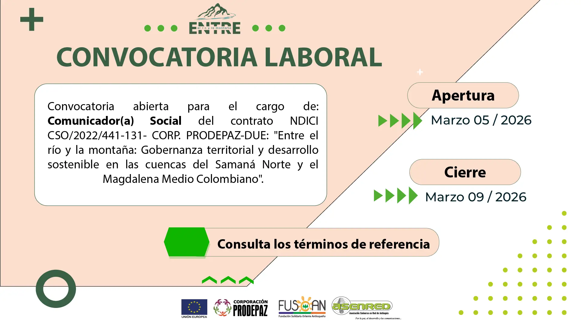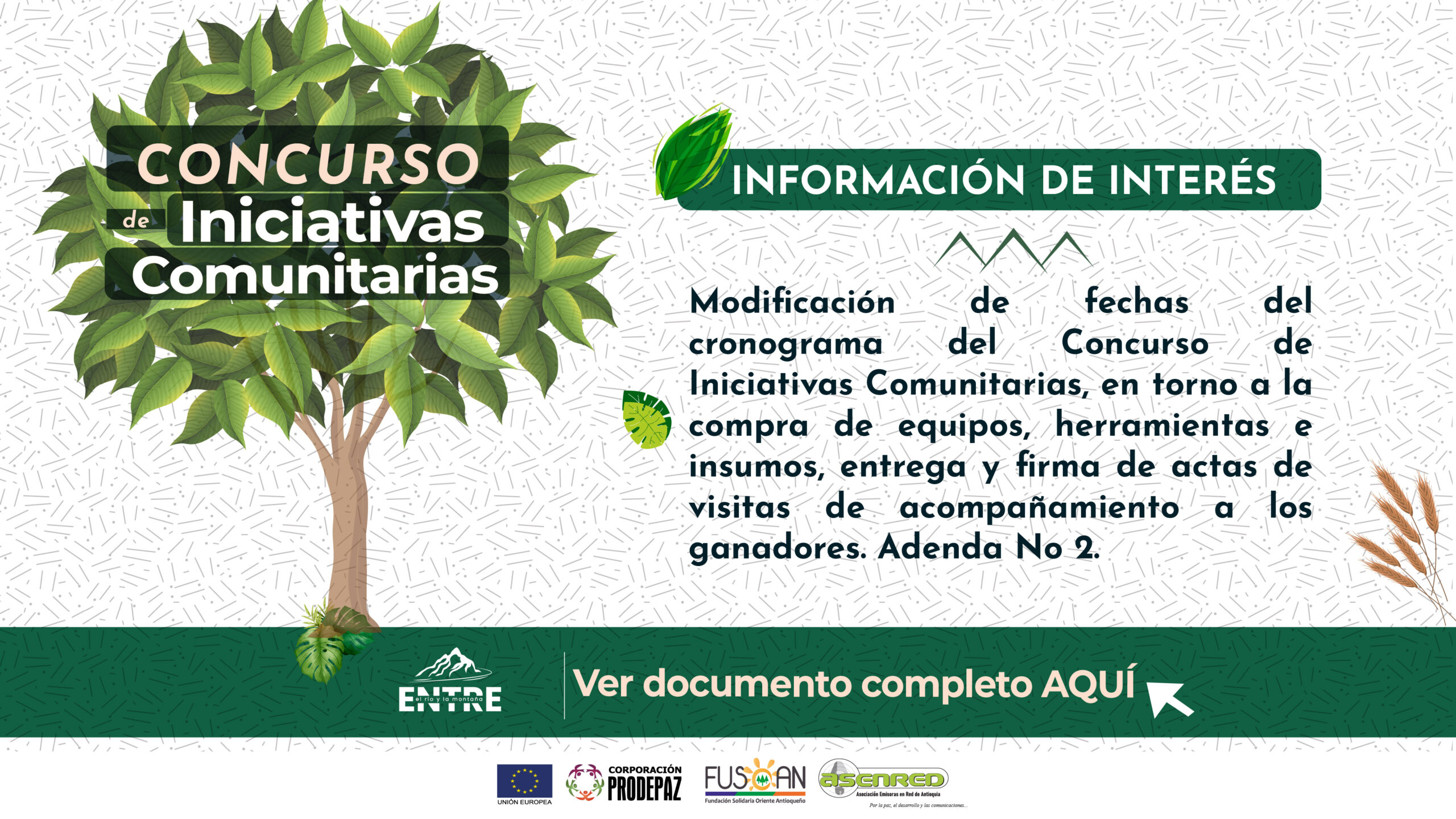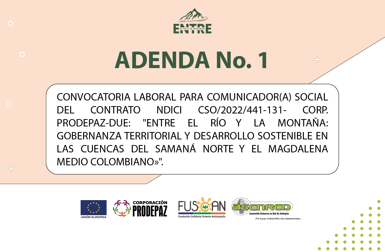 Se DECLARA DESIERTO el proceso de convocatoria al Concurso de Iniciativas Comunitarias “ENTRE EL RÍO Y LA MONTAÑA” DEL CONTRATO DE SUBVENCION ACCIONES EXTERIORES DE LA UNIÓN EUROPEA- NDICI CSO/2022/441-131:” “Entre el río y la montaña: Gobernanza territorial y desarrollo sostenible en las cuencas del Samaná Norte y el Magdalena Medio Colombiano»”, teniendo en cuenta que, no es viable continuar con el proceso competitivo, por cuanto, solo una (1) de las dieciséis (16) iniciativas postuladas cumplió con los requisitos habilitantes, pero no seria posible continuar con el proceso competitivo, puesto que no se lograría dar cumplimiento al alcance descrito en los término de referencia, donde se requiere la participación de dos (2) iniciativas por municipio de cobertura del proyecto, para un total de doce (12) iniciativas a seleccionar.